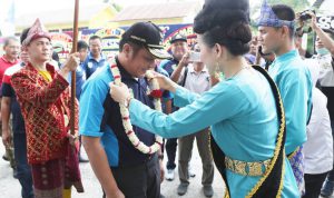 Gubernur sumsel H.Herman Deru menerima kalungan bunga