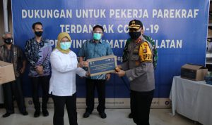 Kapolda Sumsel Irjen Pol. Prof. Dr. Eko Indra Heri S., M.M. menghadiri kegiatan penyerahan simbolis dukungan dari Kementerian Pariwisata dan Ekonomi Kreatif Republik Indonesia (Kemen Parekraf RI) untuk pekerja Parekraf yang terdampak Covid-19 Provinsi Sumatera Selatan bertempat di Lt.2 Gedung Hospitality Poltekpar Palembang Jl. Sapta Pesona Jakabaring Palembang, Jum’at (12/6)