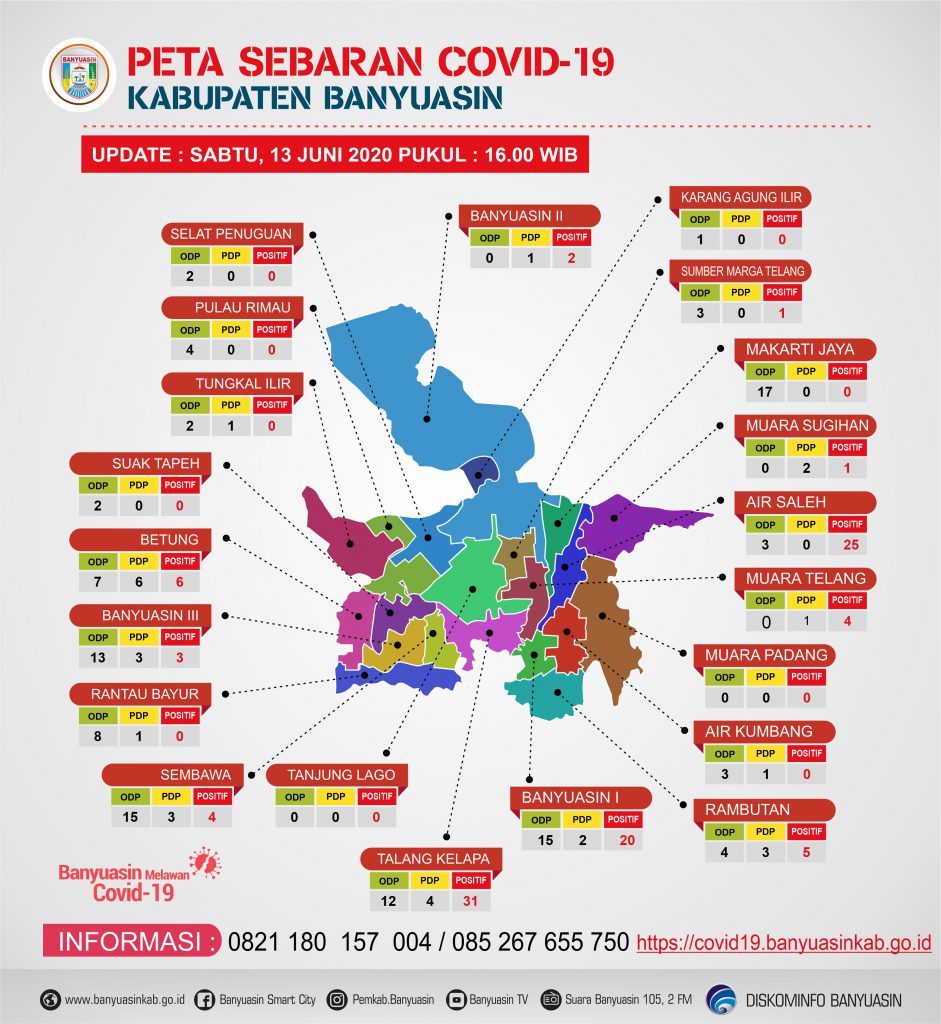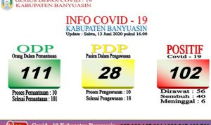 Untuk diketahui di Kabupaten Banyuasin sampai saat ini ada 102 Orang terkonfirmasi Positif diantaranya 56 orang masih dirawat, 40 orang Sembuh, dan 6 orang meninggal.