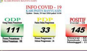 Diketahui, saat ini di Kabupaten Banyuasin terdapat 145 orang positif, 66 diantara masih dirawat, 68 orang dinyatakan sembuh dan 11 orang meninggal. Untuk PDP ada 33 orang, 7 diantara masih dalam proses pengawasan dan 26 lainnya sudah selesai pengawasan. Demkian ODP di Kabupaten Banyuasin Sendiri saat ini hanya ada 3 orang saja dari total 111 orang ODP.