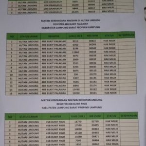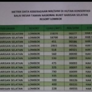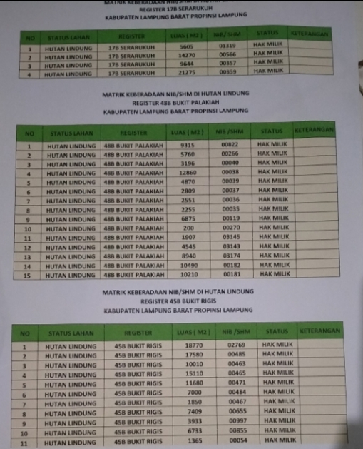 Berdasarkan hasil tim investigasi awak media bersama ormas LSM POSE RI,dari sumber dilapangan,seluruh hutan lindung wilayah  Lampung barat berjumlah 183 di duga telah bersertifikat hak milik (SHM) dan metrik keberadaan NIB.SKM Dihutan konservasi balai besar taman nasional bukit barisan Selatan resort lombok berjumlah 49  lokasi diduga telah bersertifikat ilegal