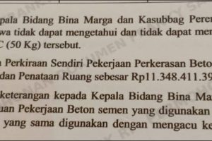 Dan pembelian semen tersebut harga satuan terbilang Rp.81.700,,00 (delapan puluh satu rupiah )dan hasil surve dipasaran harga semen persatu sak Rp 65.000.00 (enam puluh lima ribu rupiah) dengan selisih harga atau kemahalan Rp.16.700.00(enam belas ribu tujuh ratus rupiah).